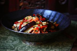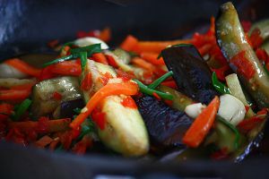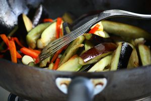 胡萝卜洗净后去皮,切细丝。不断翻炒茄子段,令其均匀吸油,变软后加入胡萝卜丝,炒一炒。