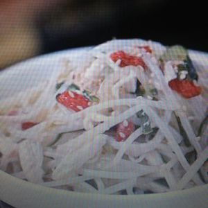 放入豆芽里,加入黄瓜丝,加入捣碎的蒜泥,加入适量的鱼露,加入香油,枸杞,白芝麻,加适量的盐,即可。