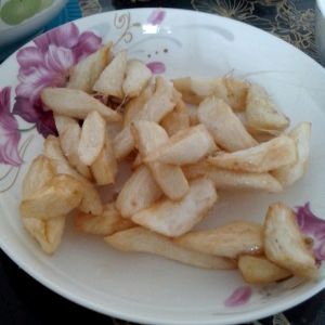 将山药清洗干净后切块,下锅炸至金黄色后出锅。
