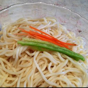 鸡蛋面下沸水锅煮至断生后,过冷水。控干水分后拌入少许色拉油备用。
