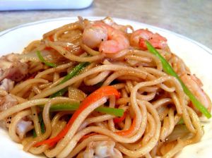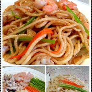 然后下入面条,虾仁,鱿鱼继续翻炒。加入生抽,蚝油,黑胡椒酱,盐,鸡精调味后,加入青椒丝,胡萝卜丝,洋葱丝大火炒匀后即可出锅。