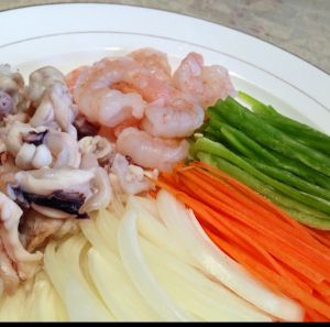 鲜虾仁,鱿鱼分别焯水后备用。青椒,胡萝卜,洋葱分别切丝。豆芽洗净备用。