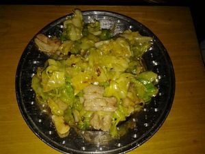 6放入包菜翻炒(如果有大的茎部可先放入翻炒)。炒软后放入生抽翻炒均匀即可