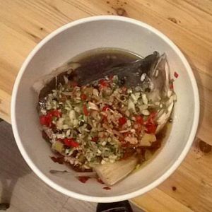 利用蒸鱼的时间切葱沫,姜沫,蒜末。鱼头蒸好后,倒掉一部分汤汁(因为这个汤汁有鱼腥味,加上水蒸汽太多了,所以倒掉一些),放剁椒在鱼头上面,让把切好的,姜末葱末蒜末放上面,浇两勺蒸鱼豉油