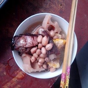 (灯光有点暗,拍得不是很清楚。)玉米莲藕洗净,斩断,花生提前泡久一点。锅里放水,倒入所有材料煮半个小时就好了!