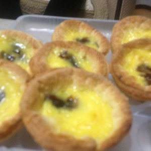 将蛋挞托放在烤盘中加入蛋液,我在蛋液里加了一点桂花豆沙。你们也可以根据自己的口味放些水果呀什么的。