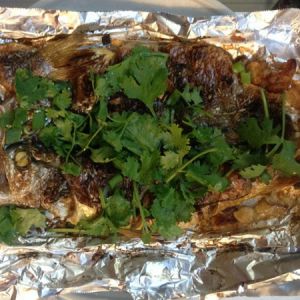比较匆忙,这是所有辅料加一起以后均匀涂抹在鱼上后的示意图!除了孜然,香菜,油,酱油以外的料腌制鱼半小时左右