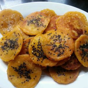 最后一步,平底锅放适量花生油,慢火,把南瓜饼放入锅内稍等有饼变黄色再翻另一面,注意动作要轻