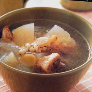 排骨、薏苡仁、冬瓜放入锅中,加2000毫升水以大火煮沸,转小火继续炖熟。加调味料即成。