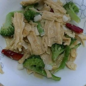 油倒锅里适中,热后倒入腐竹和菜花一起炒