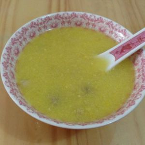 10分钟后,还只能算是玉米汤不是羹,这时倒入用生粉加水做成的芡汁,稍加搅拌,汤渐渐变粘稠。