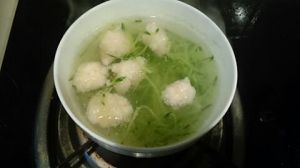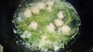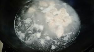 先将虾泥用勺子挖成虾球下入沸水中。