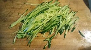将黄瓜切成细丝。
