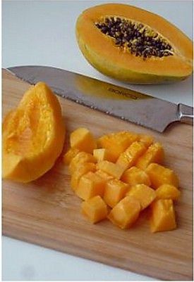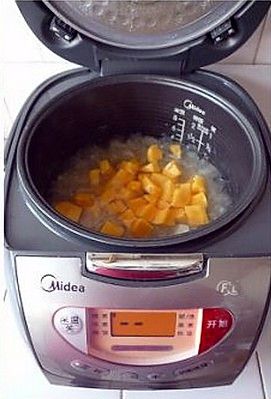 粥汤键煲2个小时后,倒入木瓜、冰糖,再用煮稀饭键煮20分钟即可。