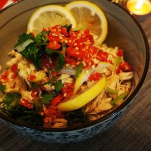 在鸡丝中依次加入生抽,小米辣,蔬之鲜,挤入柠檬汁(柠檬切成两半,一半切片装饰用,另一半酌量挤入鸡丝中)
