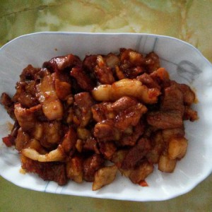 煮至啤酒收汁,加入豆瓣酱,使肉全部裹上酱。出锅