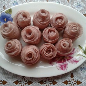 然后扭断分成两个,把面片向外翻整理一下,漂亮的玫瑰花馒头就做好了。