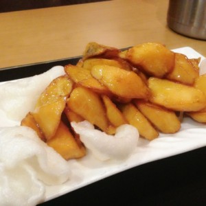 等油热到8分。地瓜放下去炸到金黄 捞起来