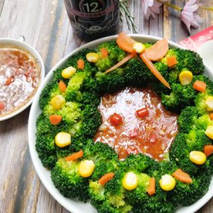 玉米胡萝卜焯水断生后摆置西兰花上装饰