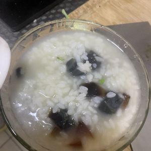 有水蒸气模糊了,先煮大米,火不要太大 容易糊锅,开花后加上瘦肉,皮蛋,5分钟后ok