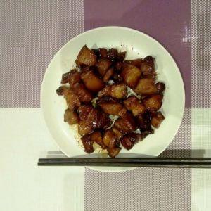 炒锅加油,烧热,加入冰糖,炒至浅黄色,加入肉丁
