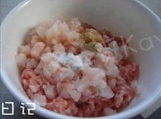 虾仁切碎,放到猪肉糜里,加1个蛋清、料酒、盐、白胡椒粉、生粉朝一个方向搅打上劲