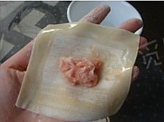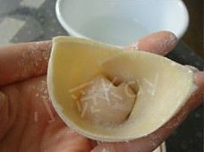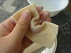 在左上角沾一点水,然后把右上边的底部粘到左上边顶部,这样一个馄饨就包好了