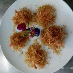 虾沾卡夫奇迹酱用土豆丝围边摆造型即可。(土豆没味道可以放椒盐)