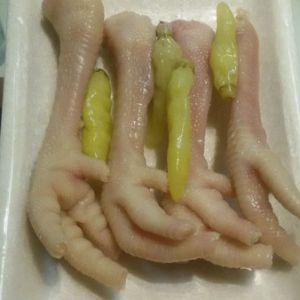 玻璃瓶里放入泡椒 原水 水不够再烧开点放点盐 花椒放凉一起加入。放入煮好的鸡爪,密封泡一两天