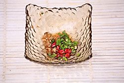 香葱末、蒜末、辣椒圈、加盐、香油、鸡精、醋调成汁。