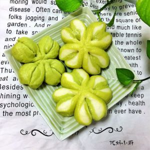 将大叶青汁混合在温水里与面粉和酵母充分混合。留出一部分白面约100g用清水活面。发酵至两倍大,揉出气泡。
