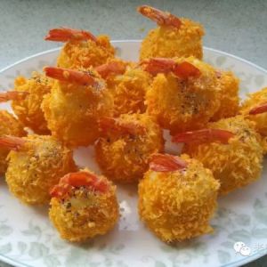 按照淀粉→鸡蛋液→面包糠的顺序依次均匀裹到虾球表面