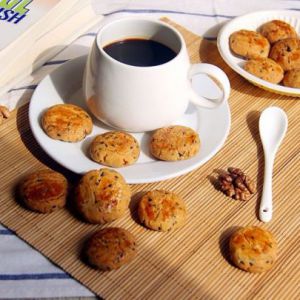 将所有材料放在一起,即面粉、核桃黑芝麻、蛋液放一起搅拌。