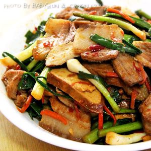 加入青蒜叶,糖,生抽,老抽,蚝油,翻炒到蒜叶略微变软后尝一尝味道,加盐调整后就出锅啦。