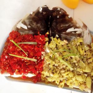 吧炒好的剁椒和小米椒铺在鱼身上!浇上剁椒瓶子里汁、小米椒汁!