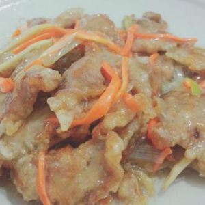 白糖,白醋,水,葱姜,胡萝卜,加热调汁。最后加少许水淀粉勾芡。倒入炸好的肉,颠勺出锅。