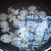锅里下水烧开,放入姜片、料酒和墨鱼仔煮滚后,关火焖3分钟。