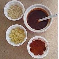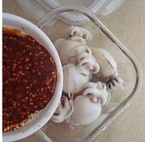 捞起墨鱼仔,立刻放入冰柠檬水里浸泡5分钟。蒜、姜切成碎粒,然后将韩式辣酱、辣椒粉、酱油、白糖、醋、蒜、姜、熟芝麻调配好。
