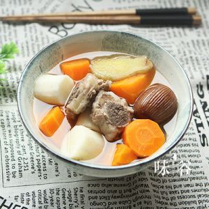 把焯好的猪排骨、切好的山药、胡萝卜、蜜枣和姜片放入锅里,加适量的水。大火烧开后小火慢炖1个半小时。