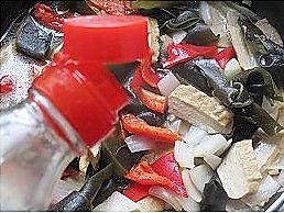 放入海带结中火煸炒一会后加入豆腐干煸炒;