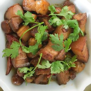 翻炒:热锅冷油(香油或者菜籽油),加干红辣椒,大蒜,花椒,桂皮,八角,翻炒。翻炒出香味后加入焯水后的五花肉,翻炒片刻后加入冰糖,冰糖炒化后加入红烧酱油上色。继续翻炒至肉皮变硬,肉里的油被炒出,放两勺盐,还可以再加入四五颗红辣椒和几个蒜瓣,看个人喜好。起锅。