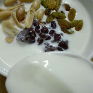 把放凉后的牛奶倒出,倒的时候要注意,先用勺子沿着奶皮和碗的接触处开一小口