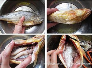 黄花鱼清洗干净,刮去鳞,从排泄口处下剪子将鱼肚拉开,将里面的心肝脾肺肾和那层膜都去掉
