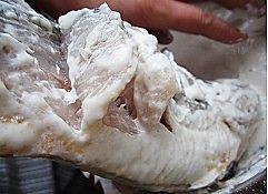 在鱼身两面拉花刀,拉花刀的手法是:刀垂直切下去再片一下,不要拉到底,切断鱼肉,喷一小勺白酒,并在鱼身两面撒盐,盐要撒均匀,花刀处和鱼腹内也都要撒盐,腌制半小时