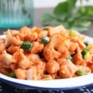 放入胡萝卜和黄瓜丁,翻炒至八分熟盛出