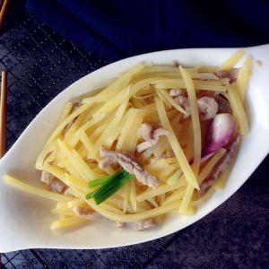 土豆削皮,只需要削掉薄薄的一层就可以了。也可以用钢丝球轻搓土豆表面,很轻松就能将外皮去掉薄薄一层,且不会损伤里面的“土豆肉”。土豆切丝,切完马上泡在水里。