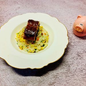 即食蒲烧鳗鱼一袋,一半切丁,一半切块,两个鸡蛋,胡萝卜丁,玉米粒,黄瓜丁