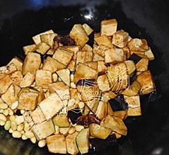 黄豆放锅中,放1个八角,加适量水,大火煮至八成熟。煮黄豆的时候开始收拾茄子,茄子洗净,切块备