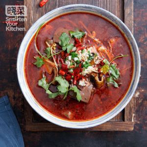 依次加入猪肚、鸡鸭血、午餐肉、鳝背一起翻滚煮5-6分钟,加入鱿鱼、牛百叶待鱿鱼卷起。