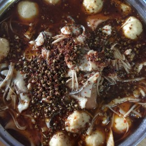将鱼肉丸子金针菇等盛出来,盛在青菜铺底的锅里,把汤倒出来。将青花椒里面的花椒和辣椒撒在上面,(没有这个料的可以自己做,把花椒用平底锅炕一下,不用油,闻到花椒香味即可,然后把花椒和辣椒面混合一起撒在上面)最后一步,用锅烧点油,油冒烟烧热即可,然后将热油浇在干花椒和辣椒上,大功告成!